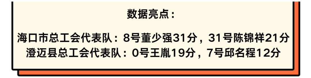 末节,澄迈队邱名程率先得分,但海口队迅速回应,董少强三分与两分轮番命中,陈锦祥、王赐福也持续输出。最终海口市总工会以93-65大胜澄迈县总工会。