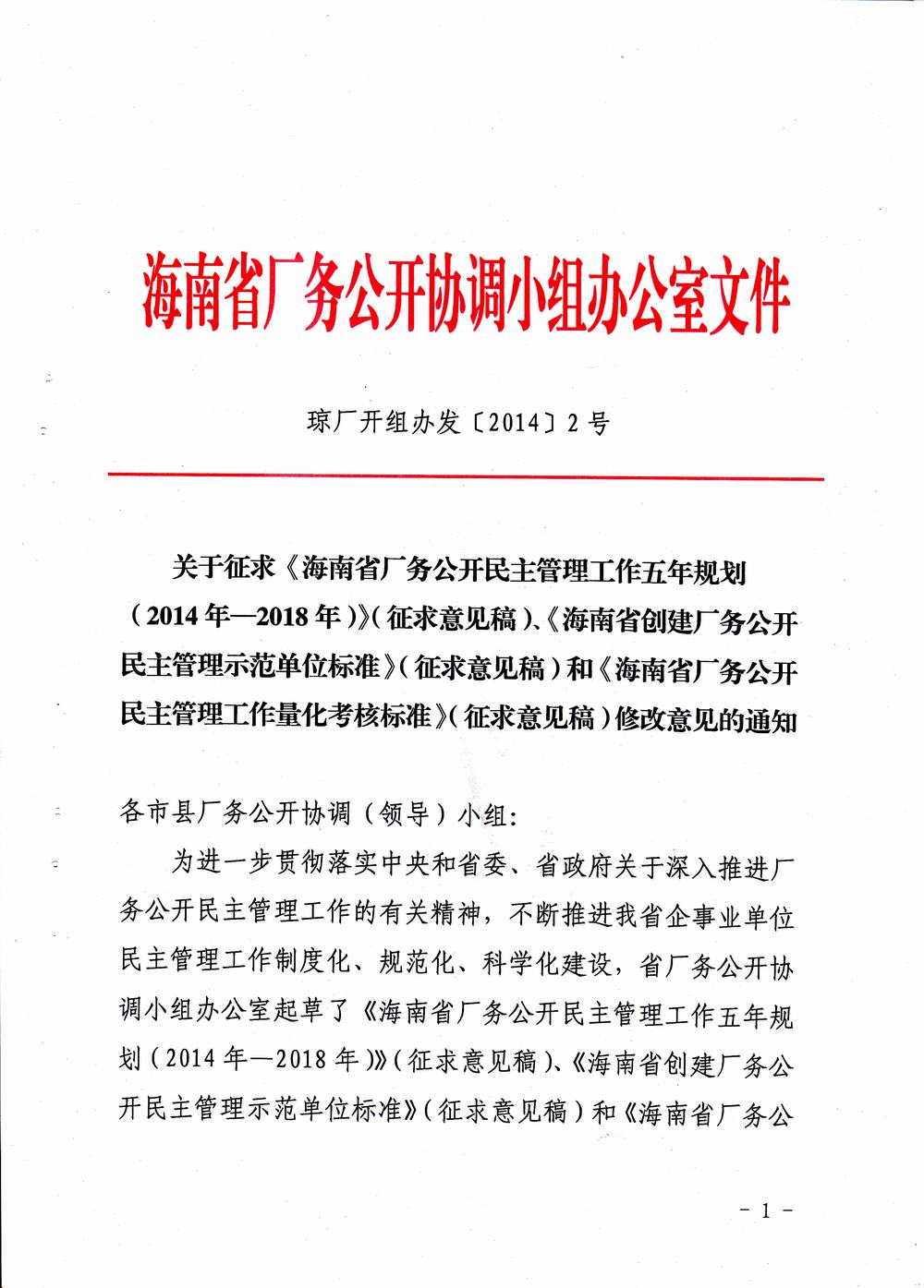 关于征求《海南省厂务公开民主管理工作五年规划2014-2018年(征求意见稿)》的通知(琼厂开组办发【2014】2号)