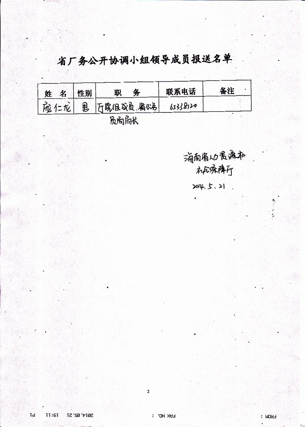 关于重新报送海南省厂务公开协调小组领导成员的函、复函(省人社厅、邓光华退休报送庞仁龙)(琼厂开组办函【2014】4号)
