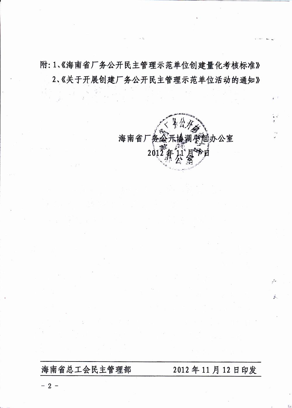 关于印发《海南省厂务公开民主管理示范单位创建量化考核标准(暂行)》的通知(琼厂开组发【2012】11号)