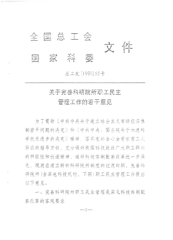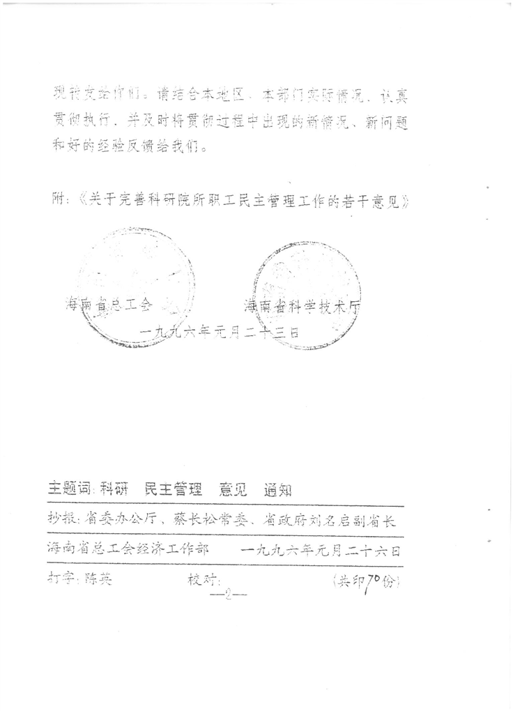 海南省总工会、省科学技术厅文件,关于转发《关于关于完善科研院所职工民主管理工作的若干意见》的通知(琼工总[1996]9号)