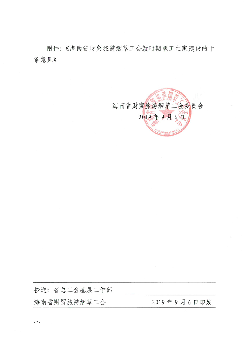 关于印发《海南省财贸旅游烟草工会新时期职工之家建设的十条意见》的通知(琼财旅烟工发〔2019〕77号)