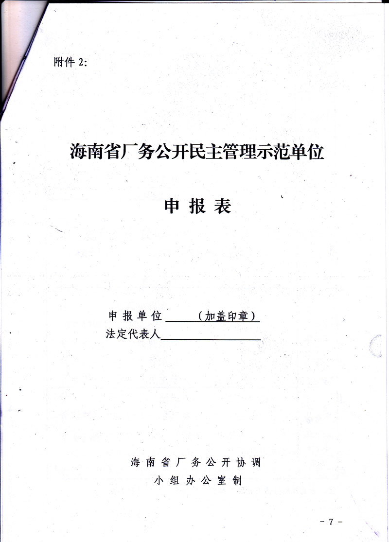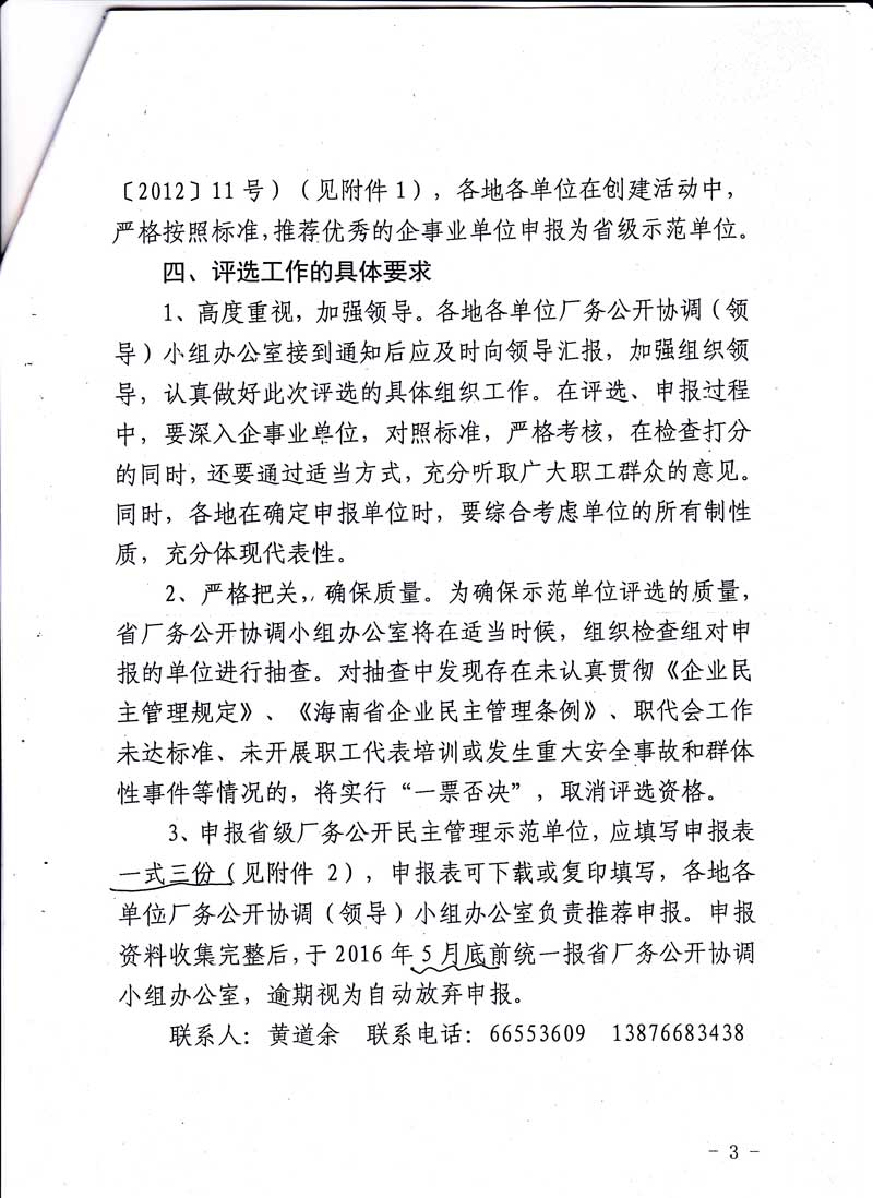 关于评选表彰海南省厂务公开民主管理示范单位的通知(琼厂开组办发[2016]1号)