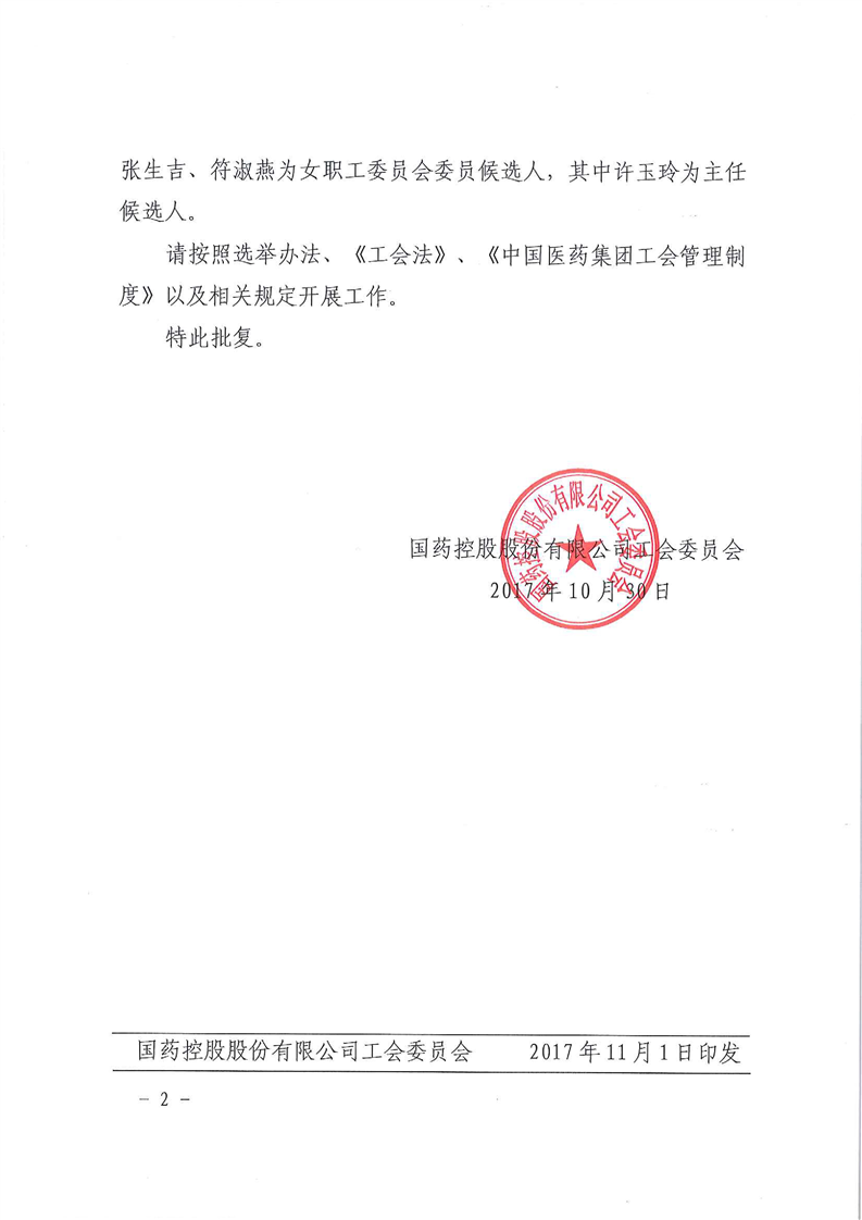 关于同意国药控股海南鸿益有限公司工会第二届委员会、主席候选人的批复